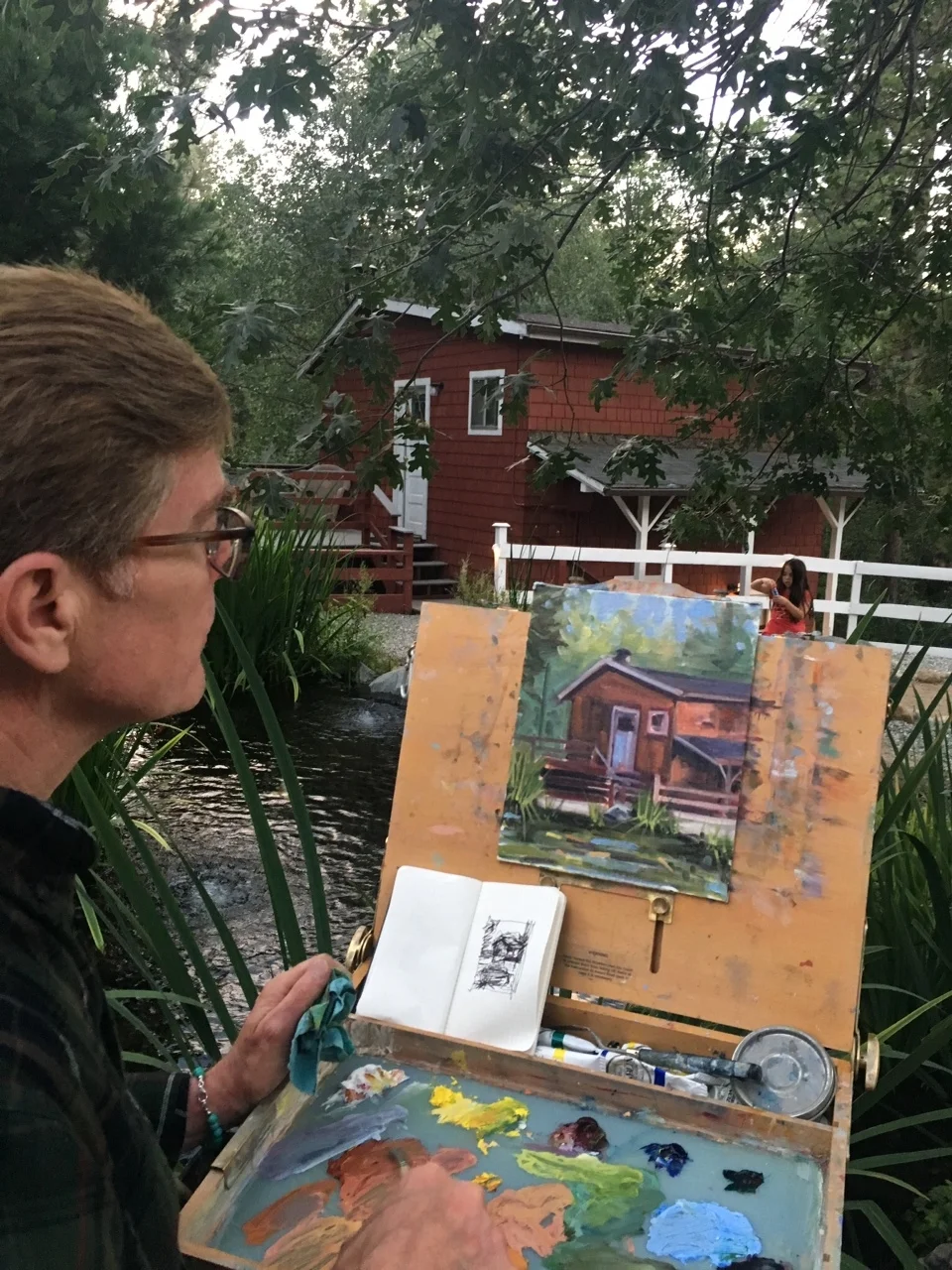 /I did a fun painting of a red cabin at Silver Pines Lodge in Idyllwild last weekend. I wanted to catch the evening light on the cabin and the little pond in front. Great weekend! Idyllwild is one of my favorite places to visit, great art community.